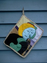 I love to sew, but I also love art history and politics. Over the past few months, I’ve had fun fabricating potholders, bibs (for querulous adults) and wall hangings inspired by famous artists of the 20th century, contemporary buzzwords from the news, and lost-and-found jewelry. I like to straddle the Great Gap that separates crafts like sewing, embroidery, quilting and weaving from fine art painting.